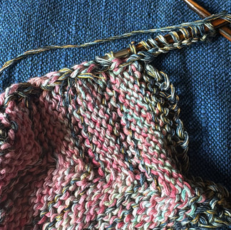 So weiter stricken mit Farbwechsel alle 4 Reihen, Kontrastfarbe immer kraus rechts, bunte Farbe immer glatt rechts. Am Ende sind noch 3 Maschen auf der Nadeln in der letzten Rückreihe. Diese 3 in der letzten Hinreihe zusammenstricken und Faden durch die verblieben Masche ziehen: